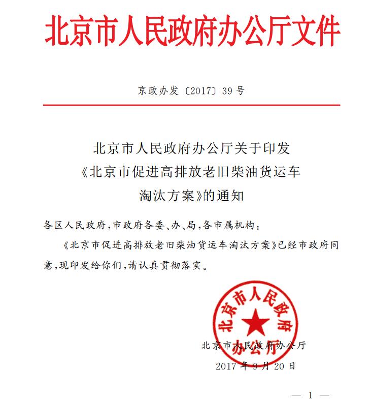 北京市人民政府辦公廳關于印發(fā)《北京市促進高排放老舊柴油貨運車淘汰方案》的通知